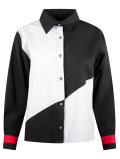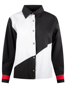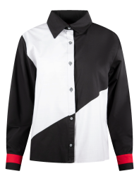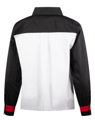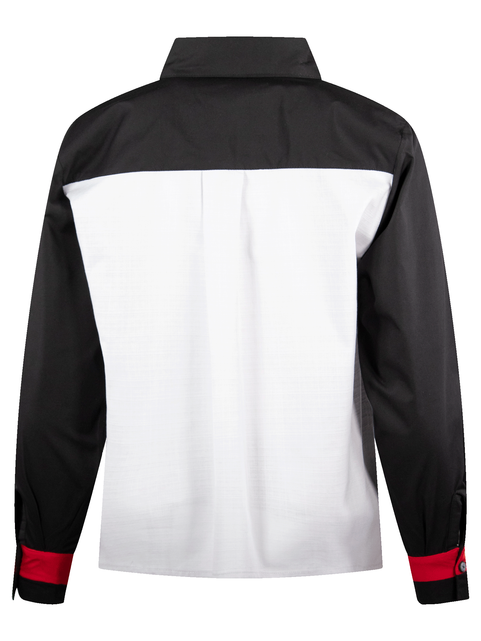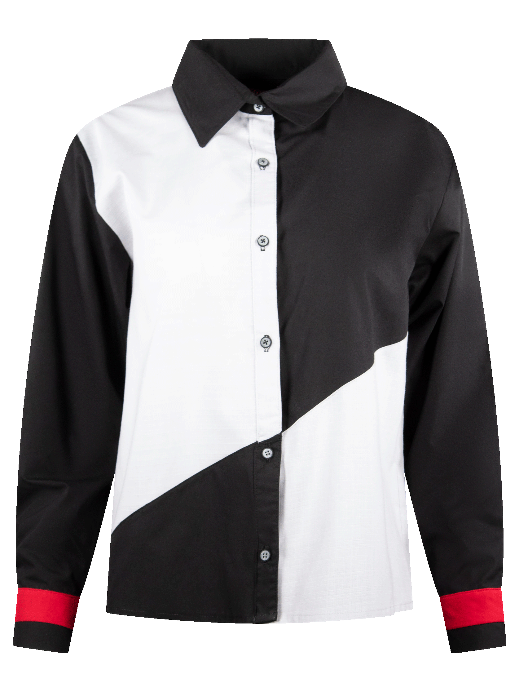 Camisa de manga larga, con bloques de tela negra y gris, detalles de color rojo en puños. Prenda confeccionada con recuperación de telas rescatadas de maquiladoras de ropa.