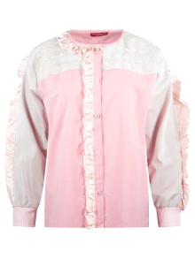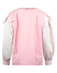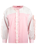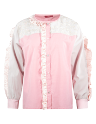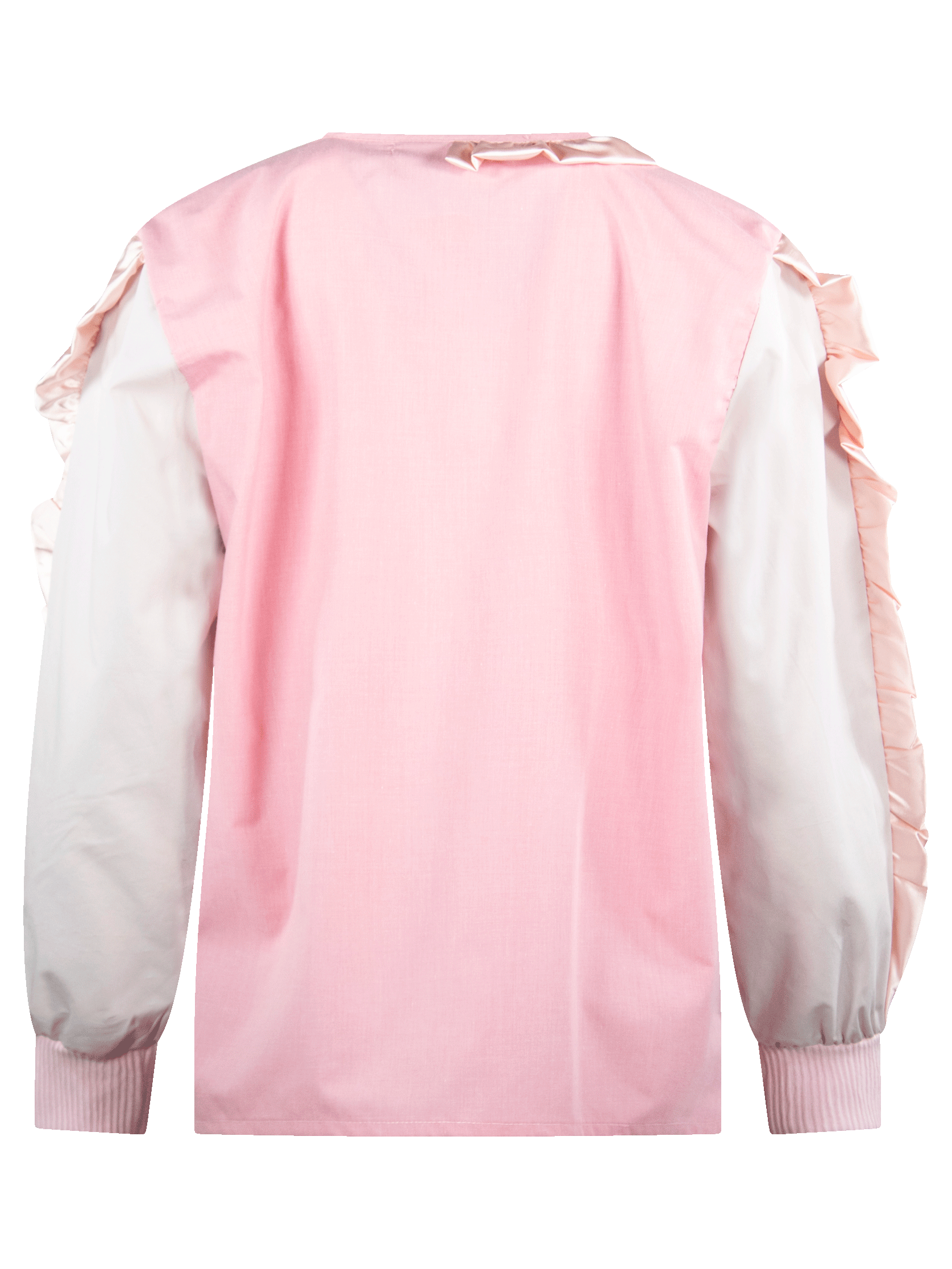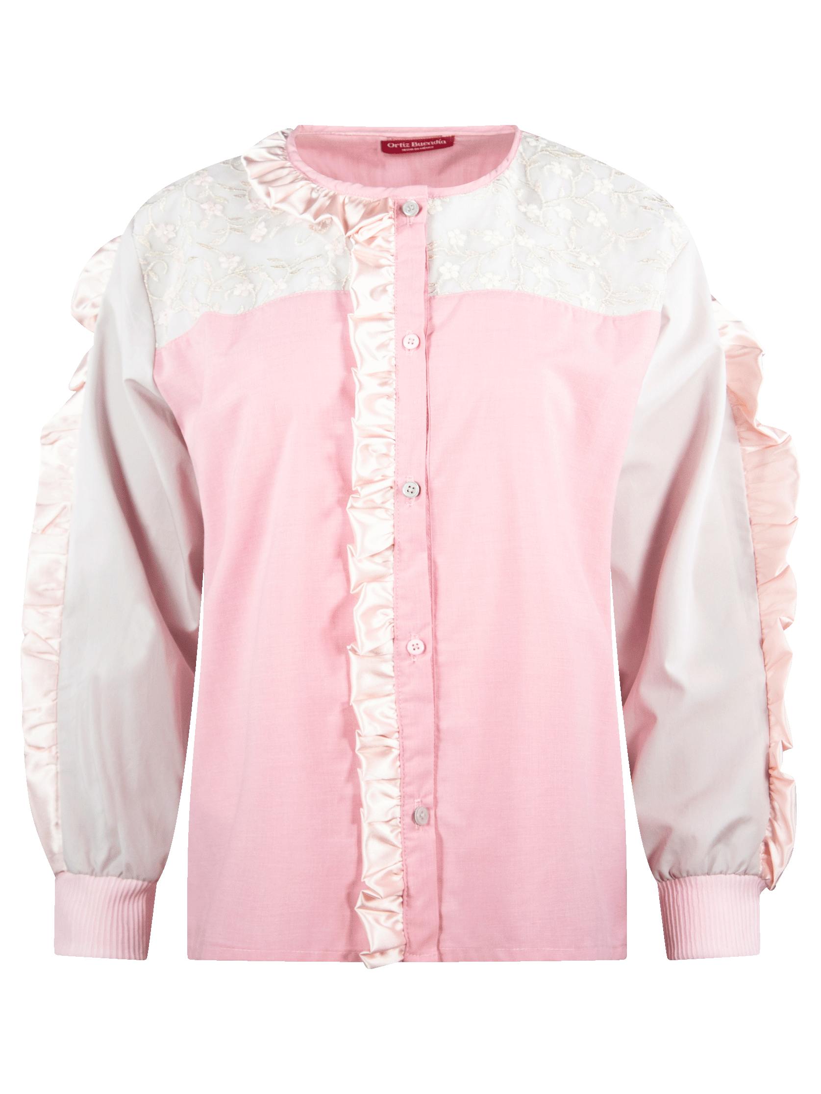 Camisa de escote redondo, manga larga, con aplicación de listón de cuello a centro delantero y en mangas. Prenda confeccionada con recuperación de telas rescatadas de maquiladoras de ropa.