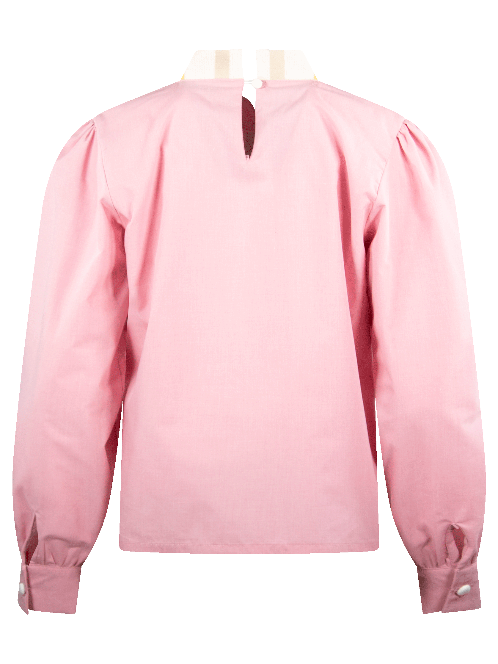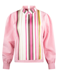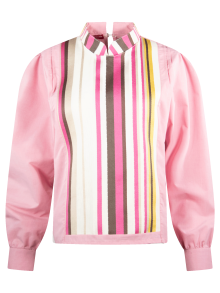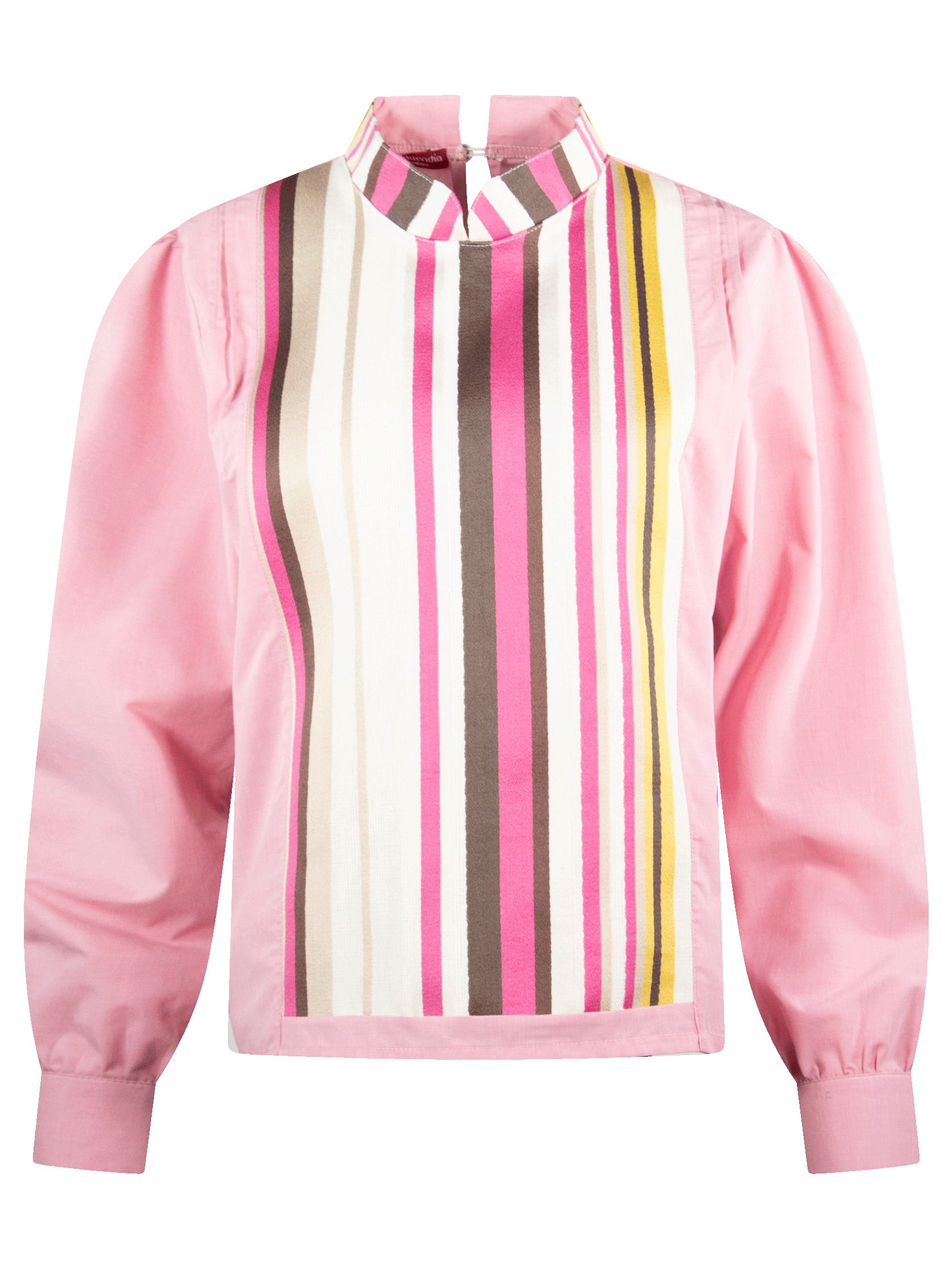 Camisa de manga larga, cuello mao, con bloque de tela rayada al delantero. Prenda confeccionada con recuperación de telas rescatadas de maquiladoras de ropa.