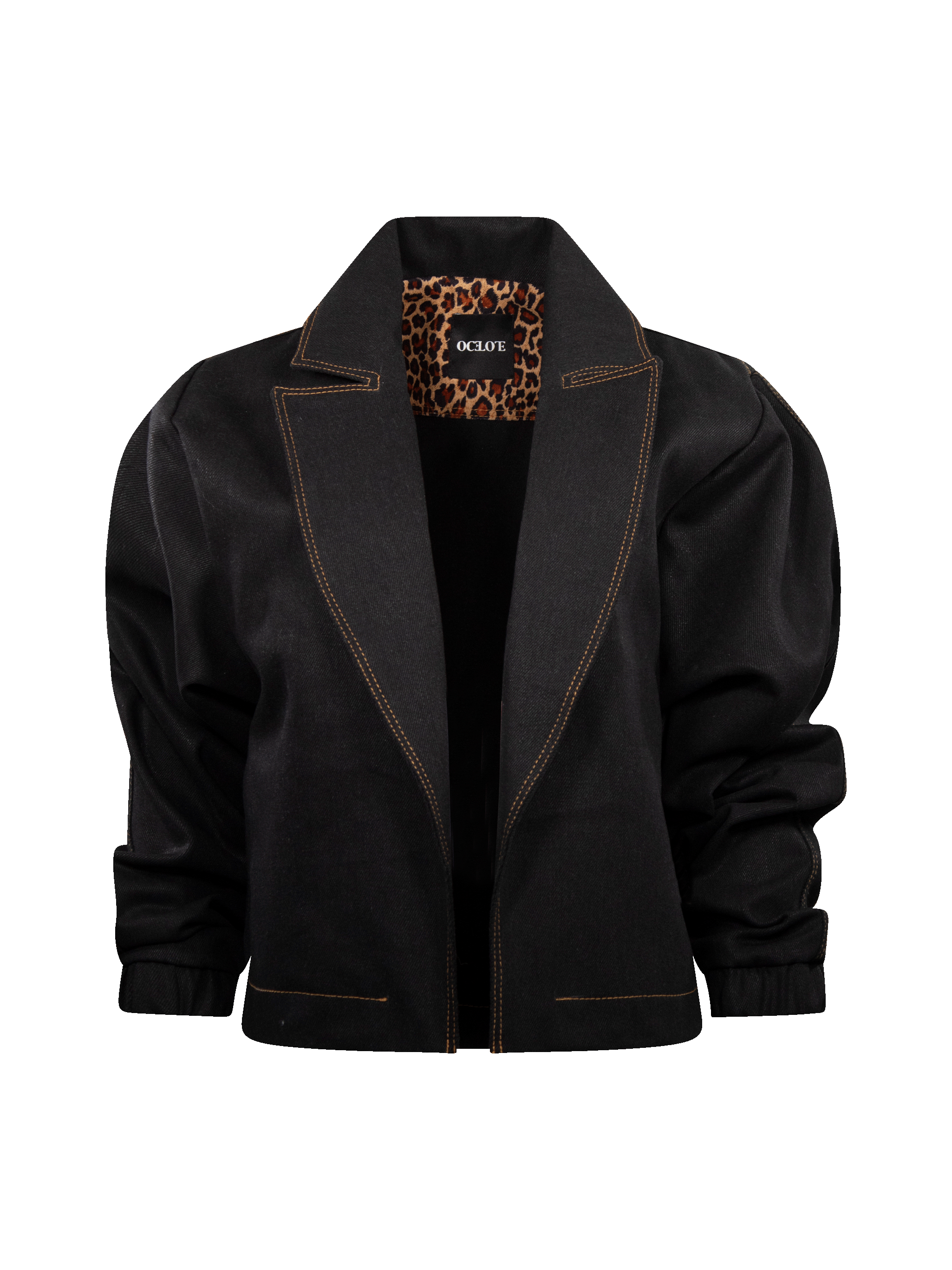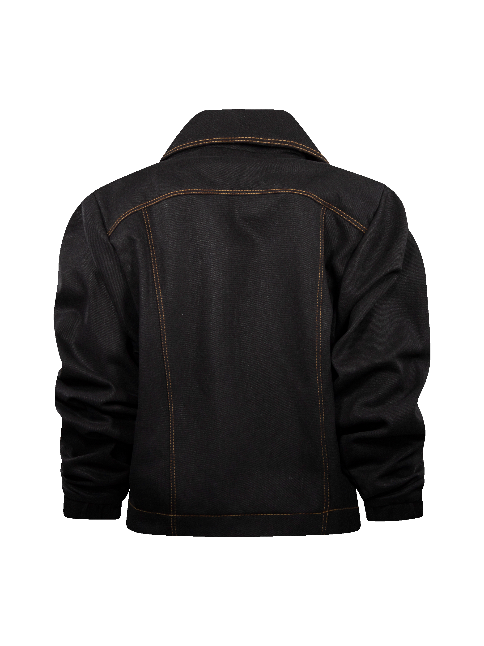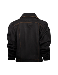 Chamarra de mezclilla corta, abierta, con solapa y cuello.