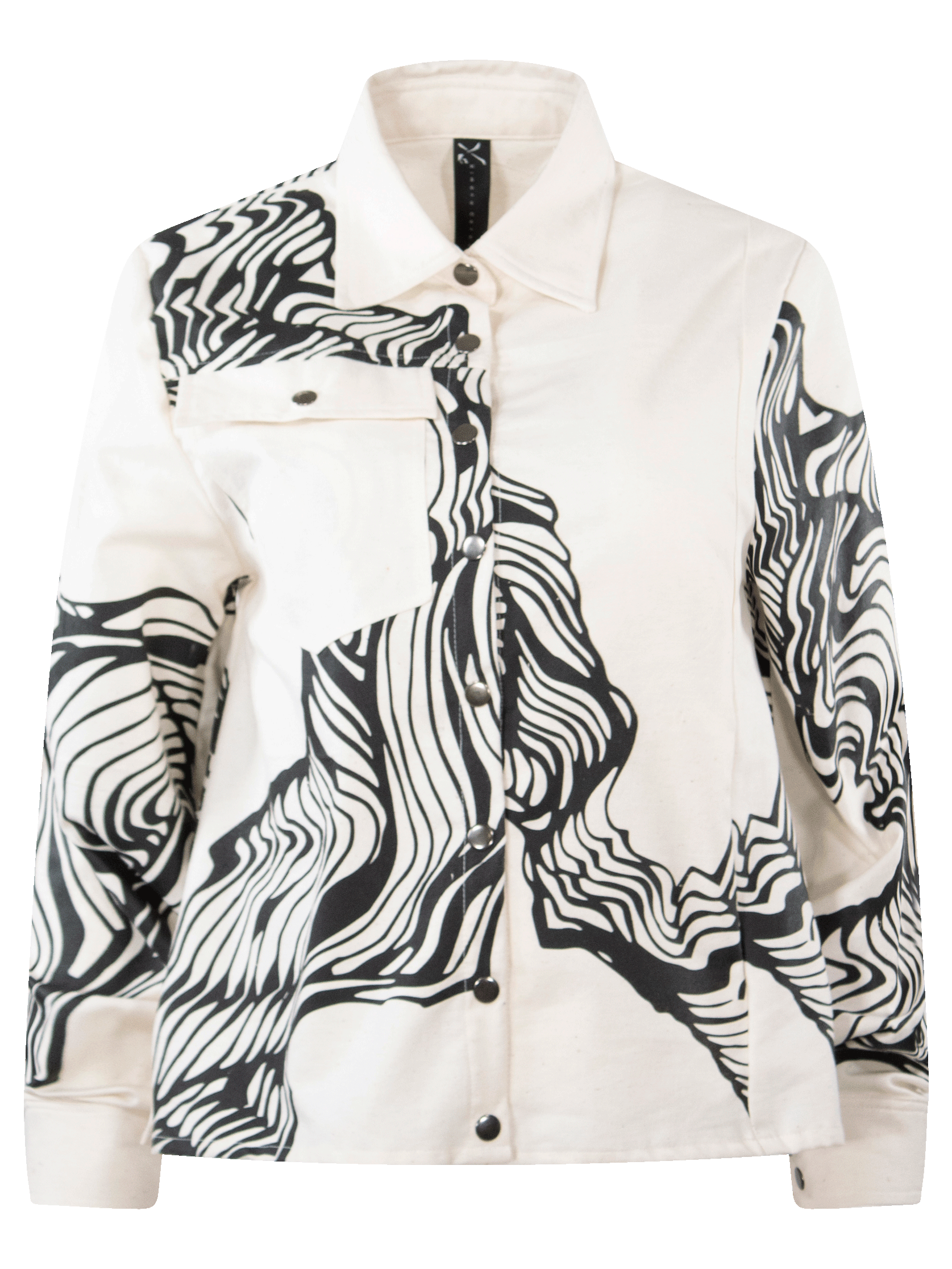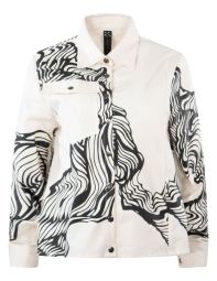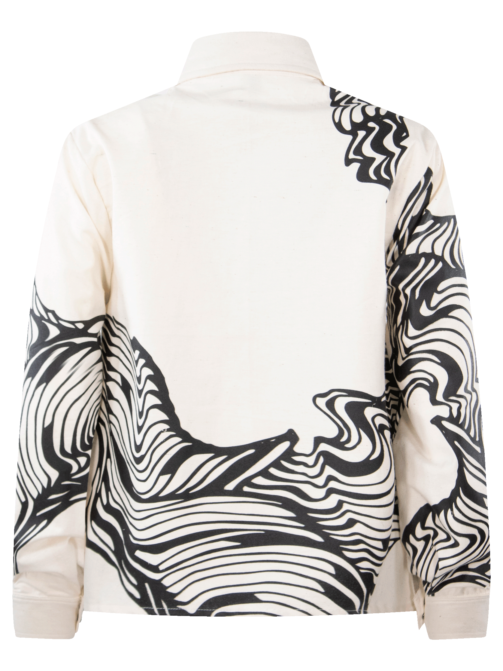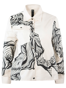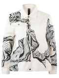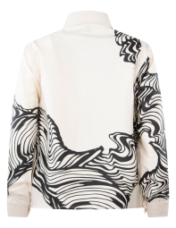 Chamarra beige con gráficos de líneas color negro, tiene una bolsa al frente.