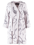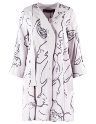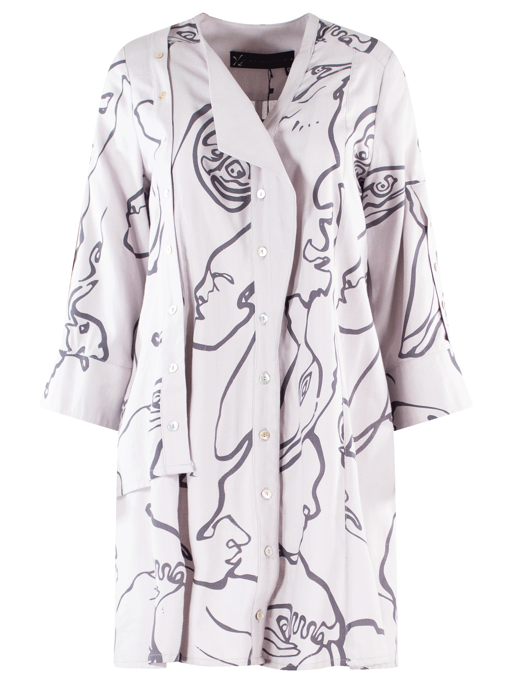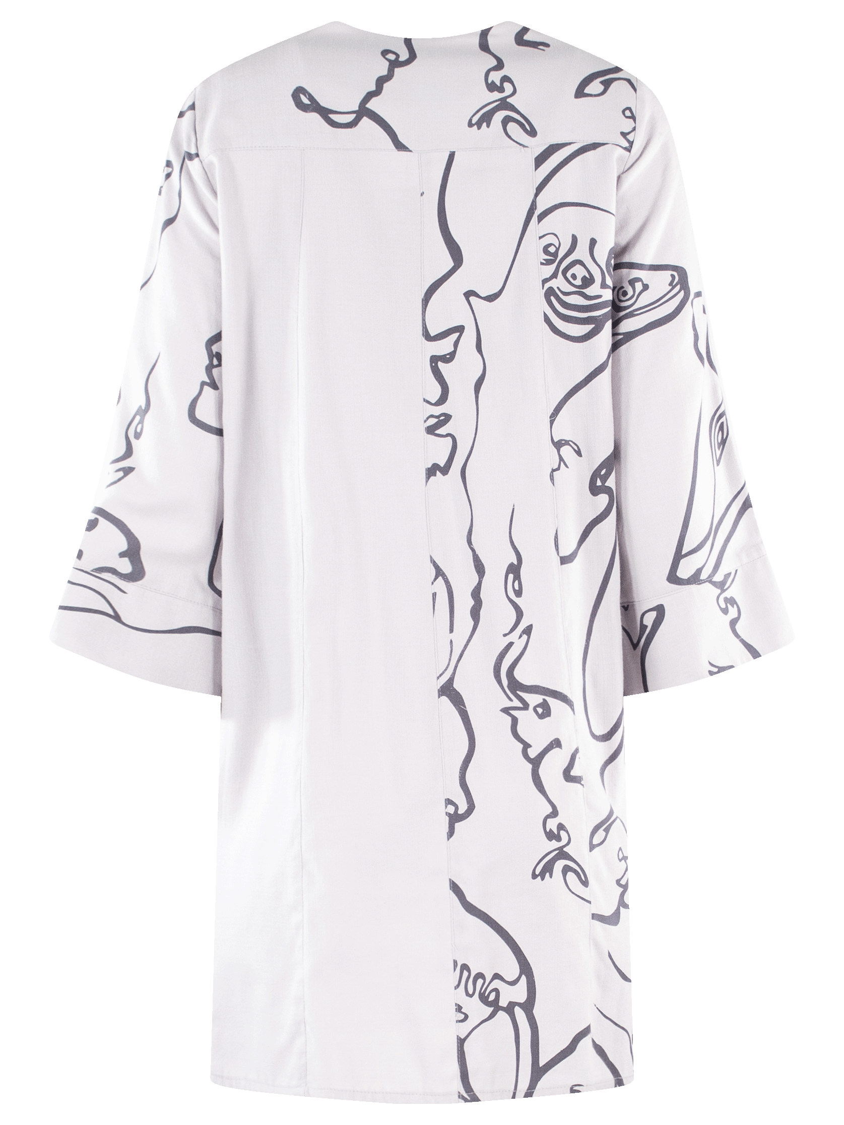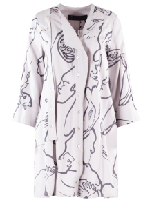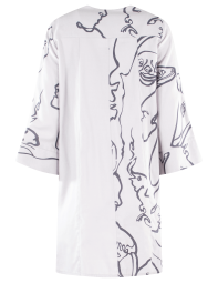 Vestido tipo Kimono con detalles de botones y gráficos de líneas y rostros.
