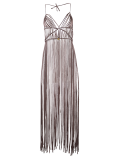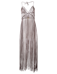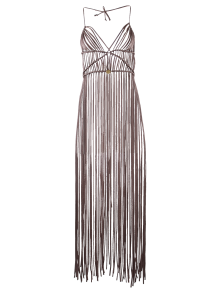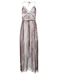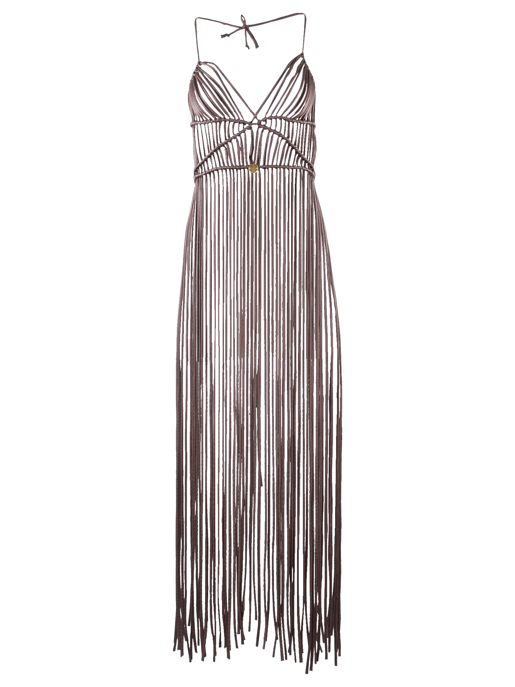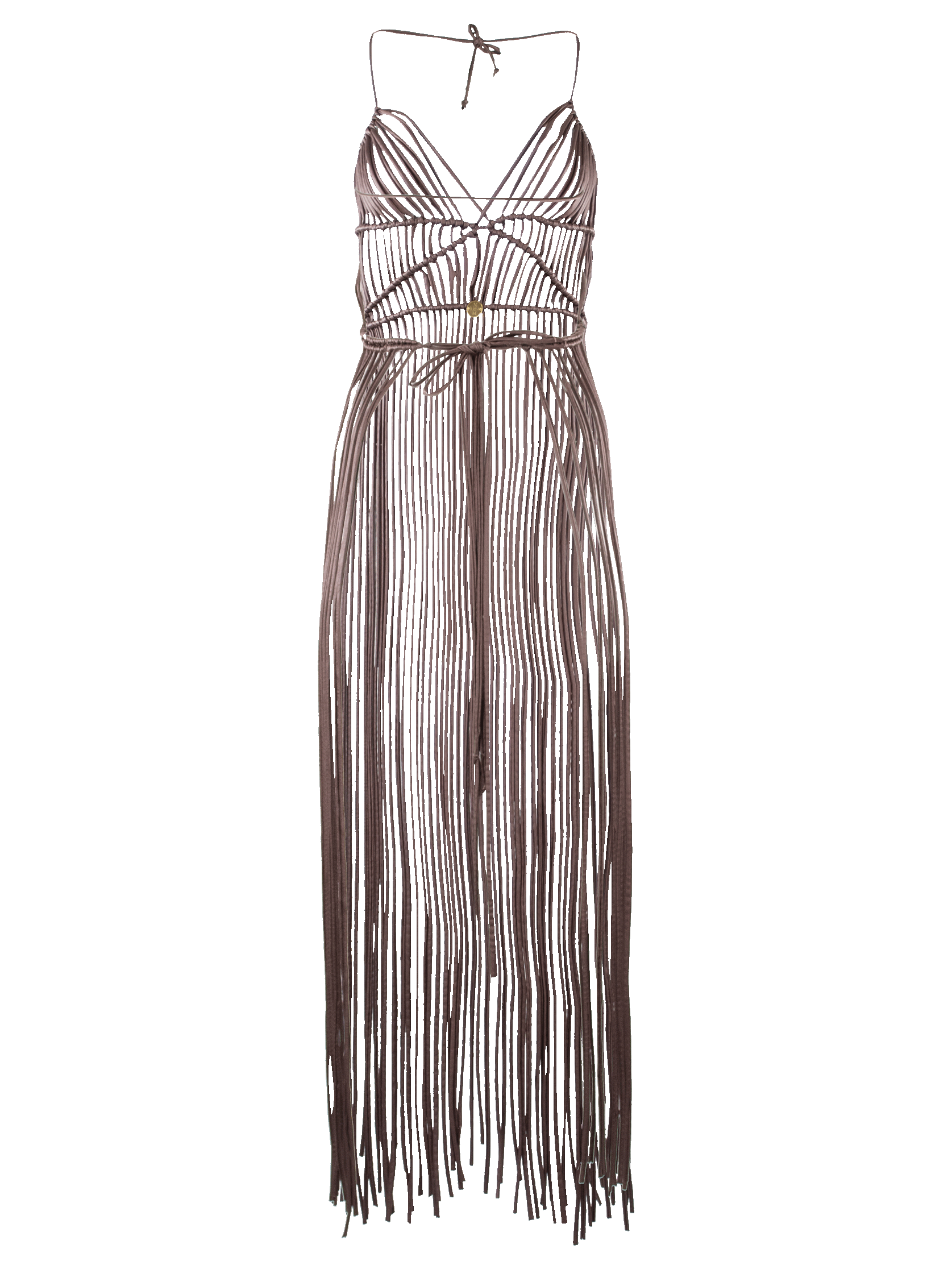 Vestido largo, de macramé en trapillo con textura de piel, con cintas ajustables en cintura y cuello.