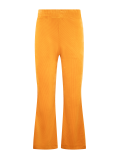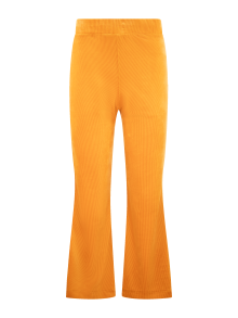Pantalones ceñidos, acampanados, con pretina enresortada. Prenda confeccionada con recuperación de telas rescatadas de maquiladoras de ropa.