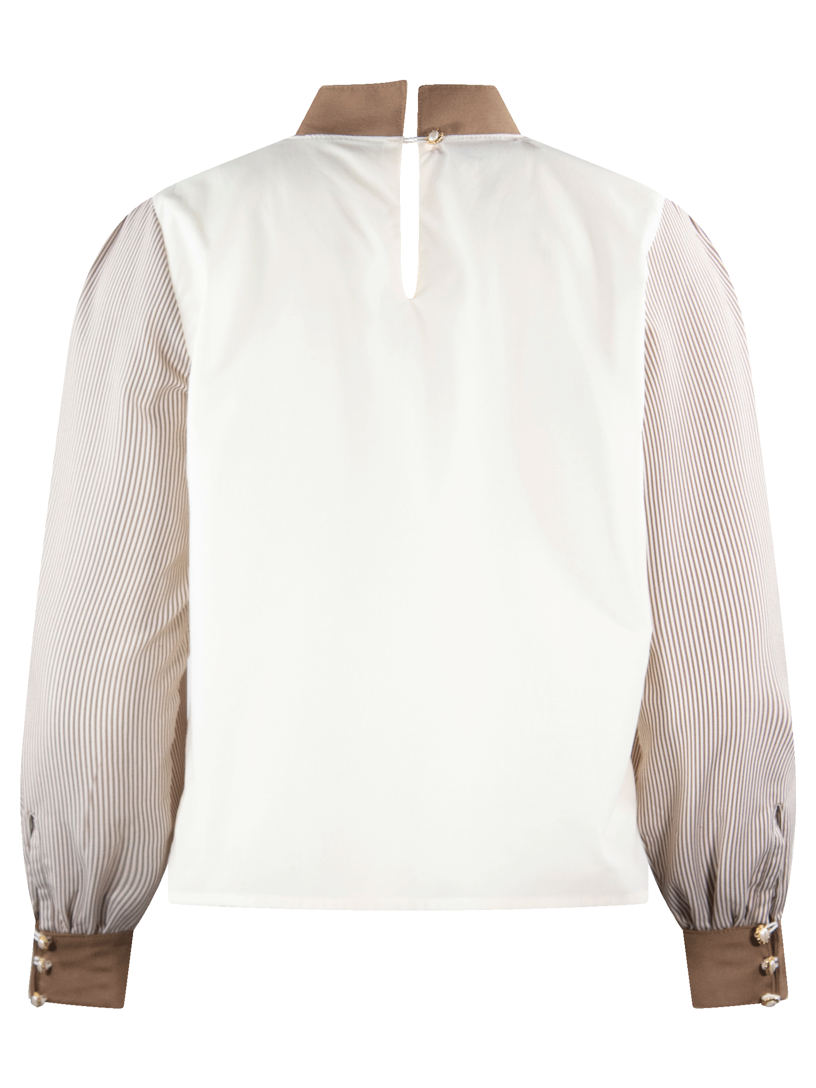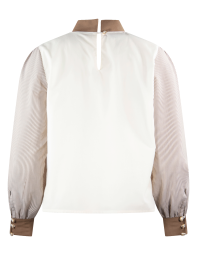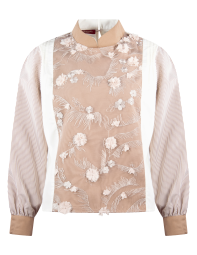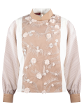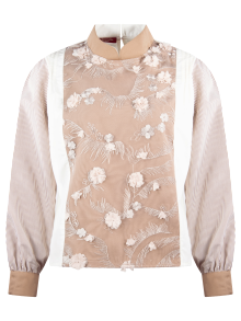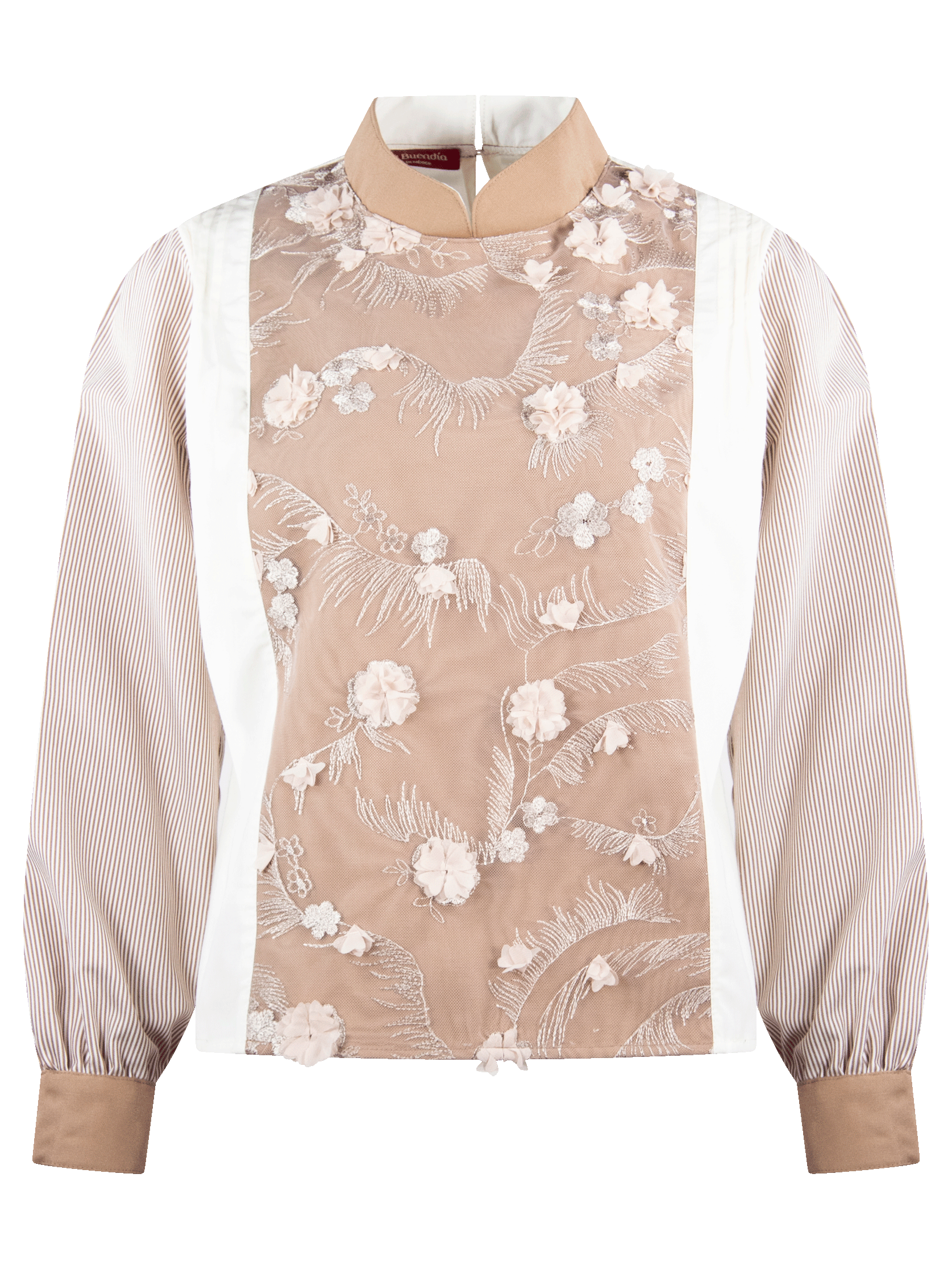 Camisa cerrada, cuello mao, mangas largas, con bloque de flores al delantero. Prenda confeccionada con recuperación de telas rescatadas de maquiladoras de ropa.