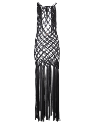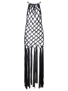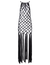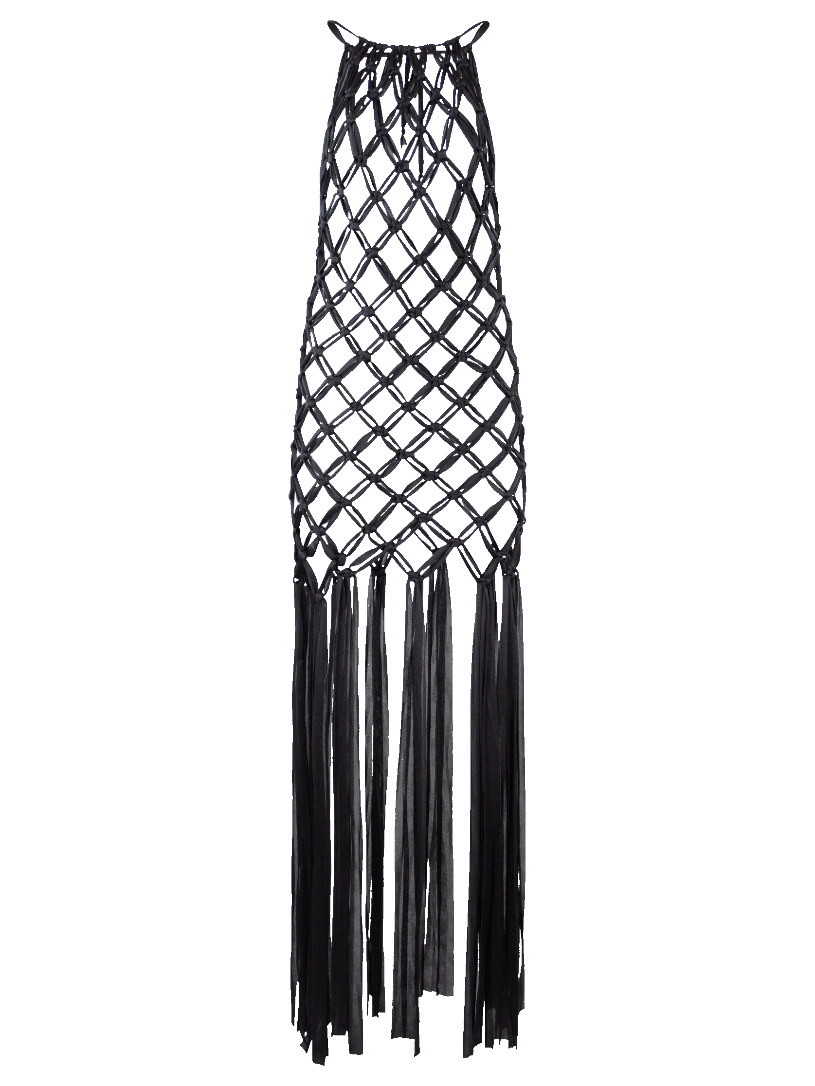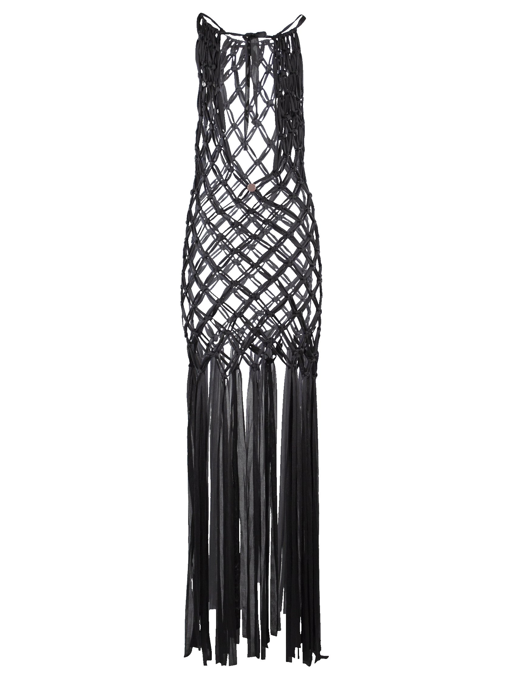 Vestido largo, de macramé en trapillo, tipo red, con tiras colgantes, abertura en espalda y cintas ajustables en cuello.