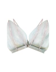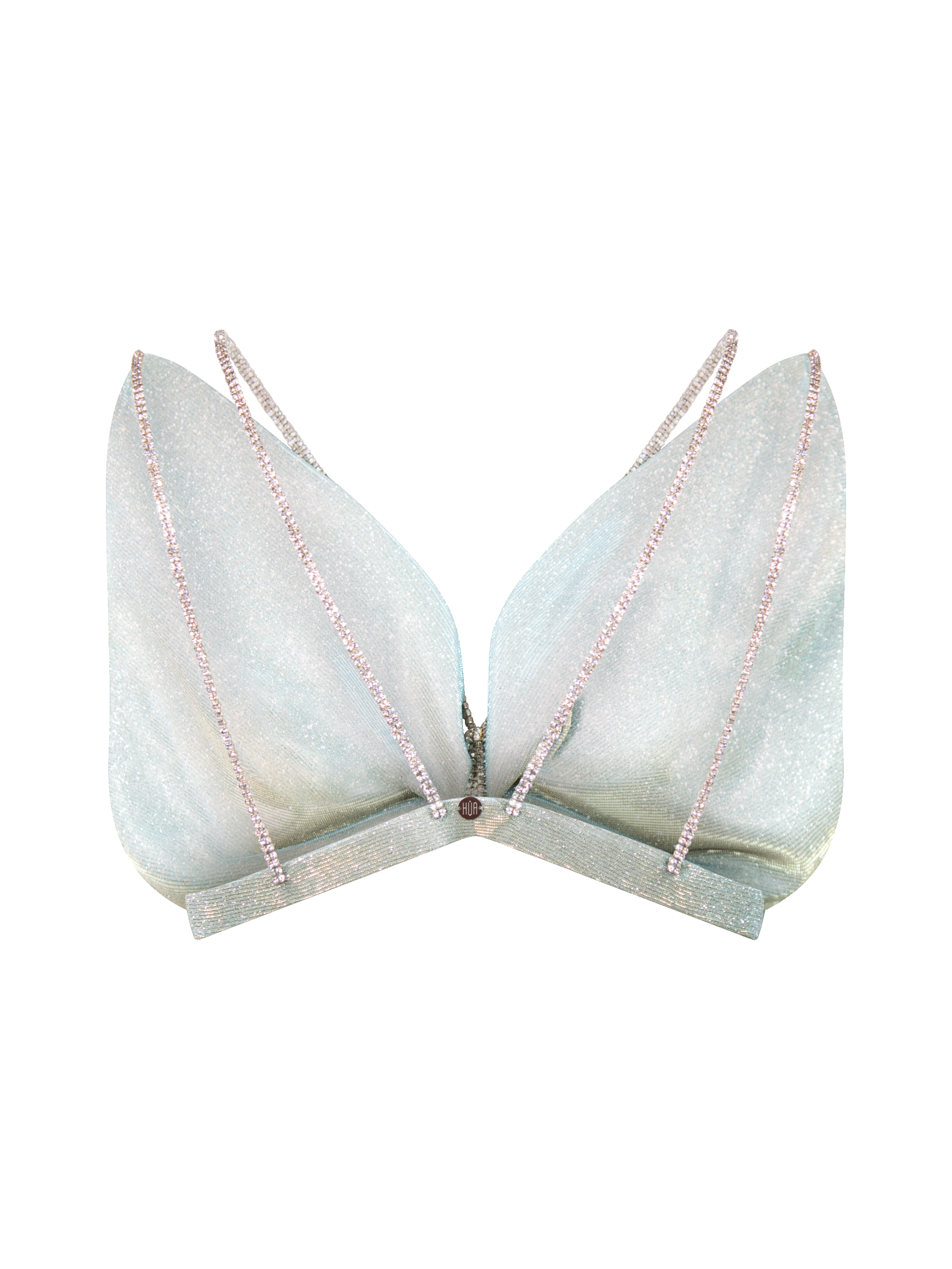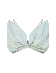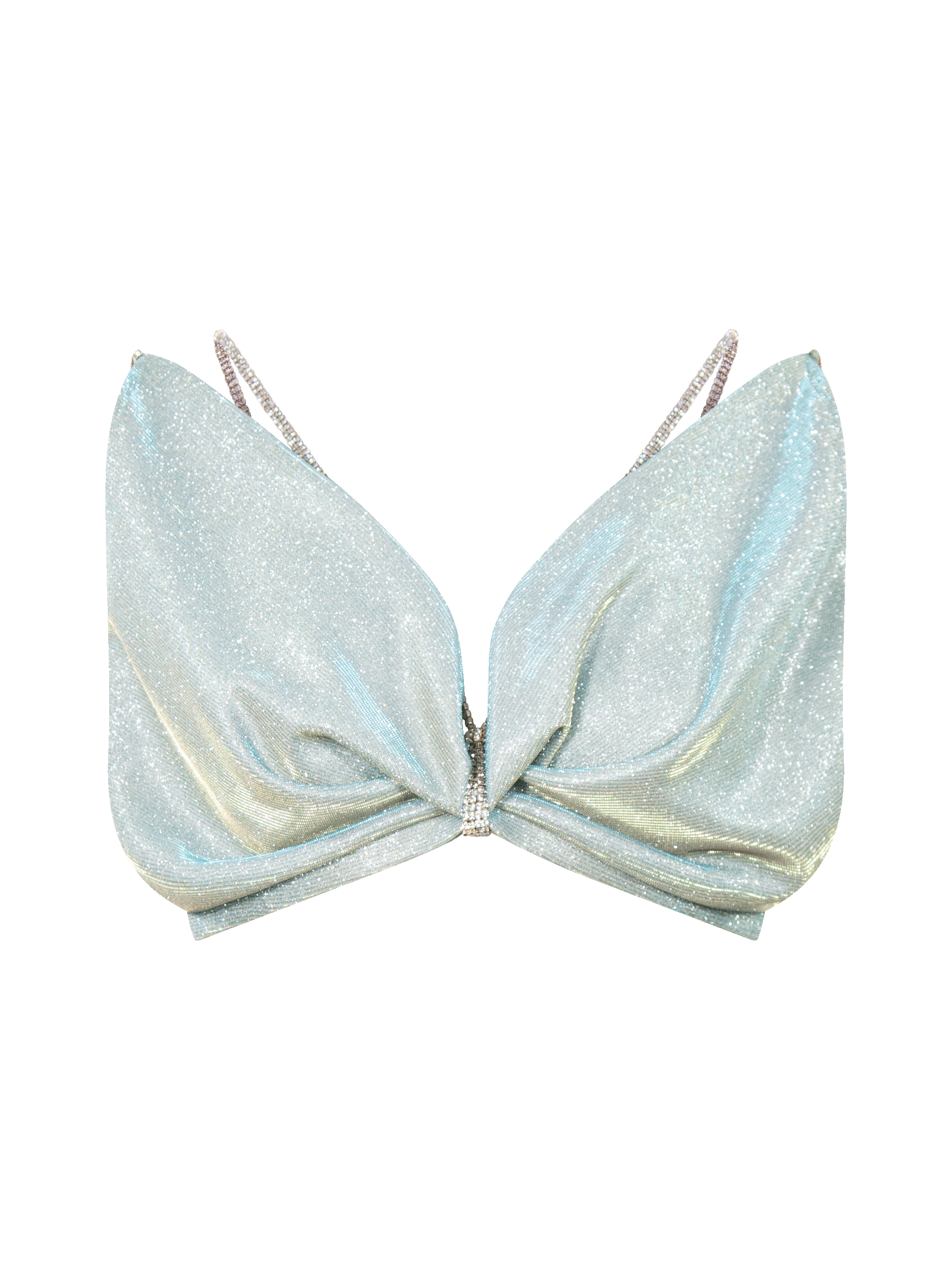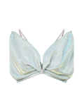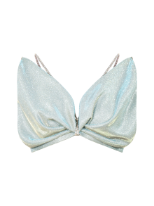 Top de tirantes, tela brillante, en forma de moño, espalda descubierta.