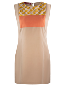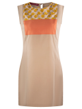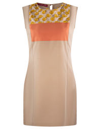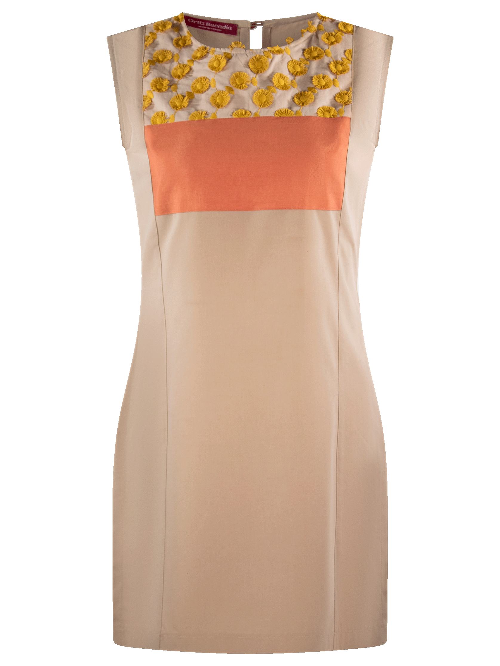 Vestido camisero, sin mangas, escote redondo, largo medio, con bloque de textura y bloque de color al delantero superior.