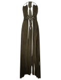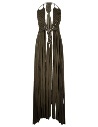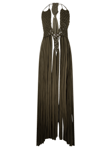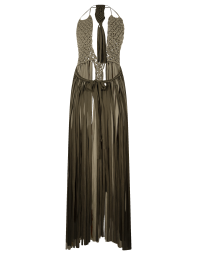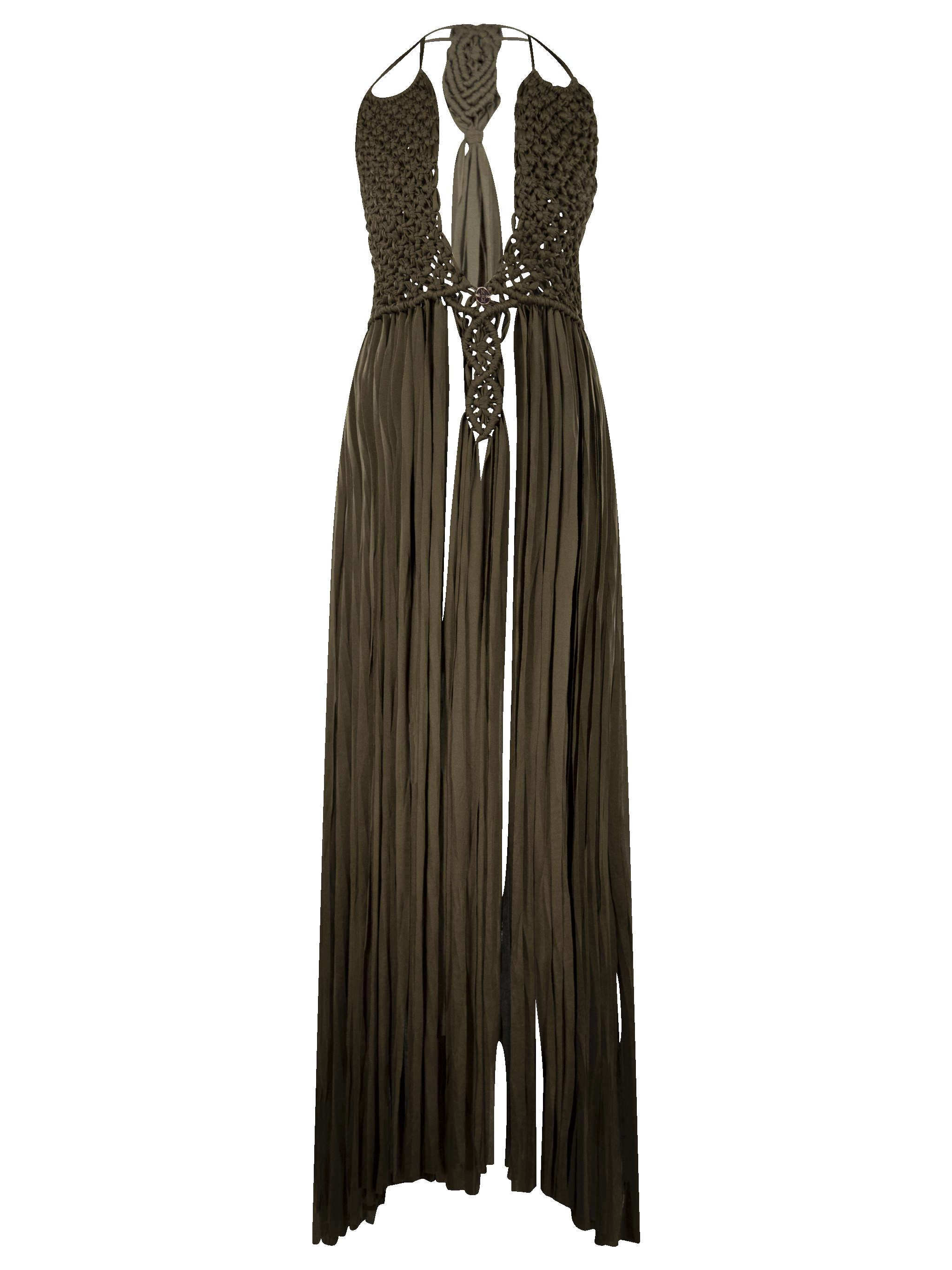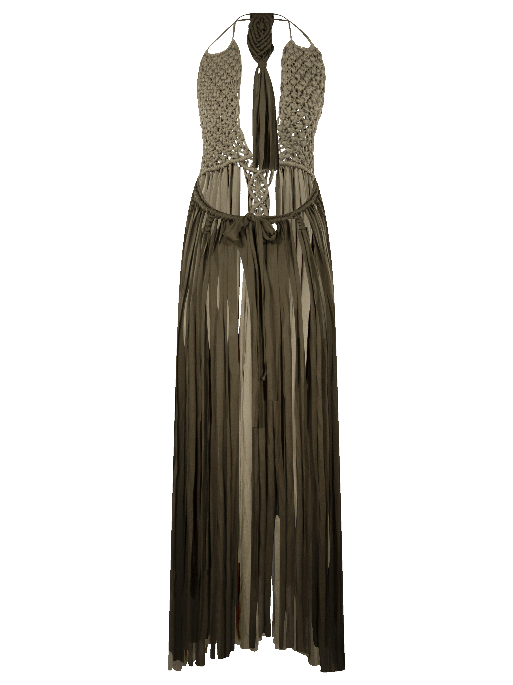 Vestido largo, de macramé en trapillo, con escote pronunciado y cintas ajustables en cuello y cintura.