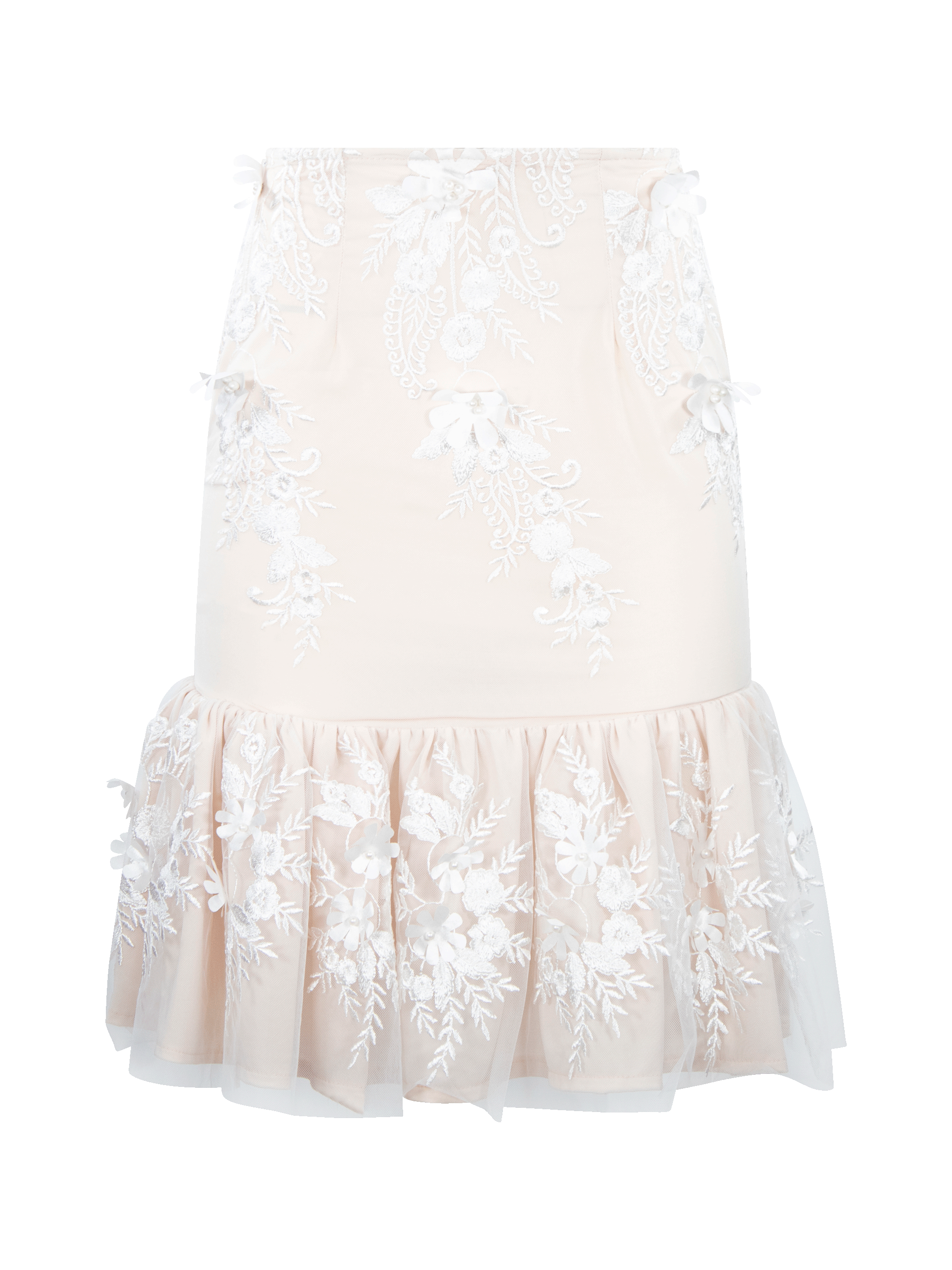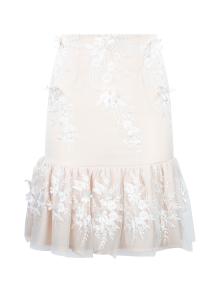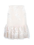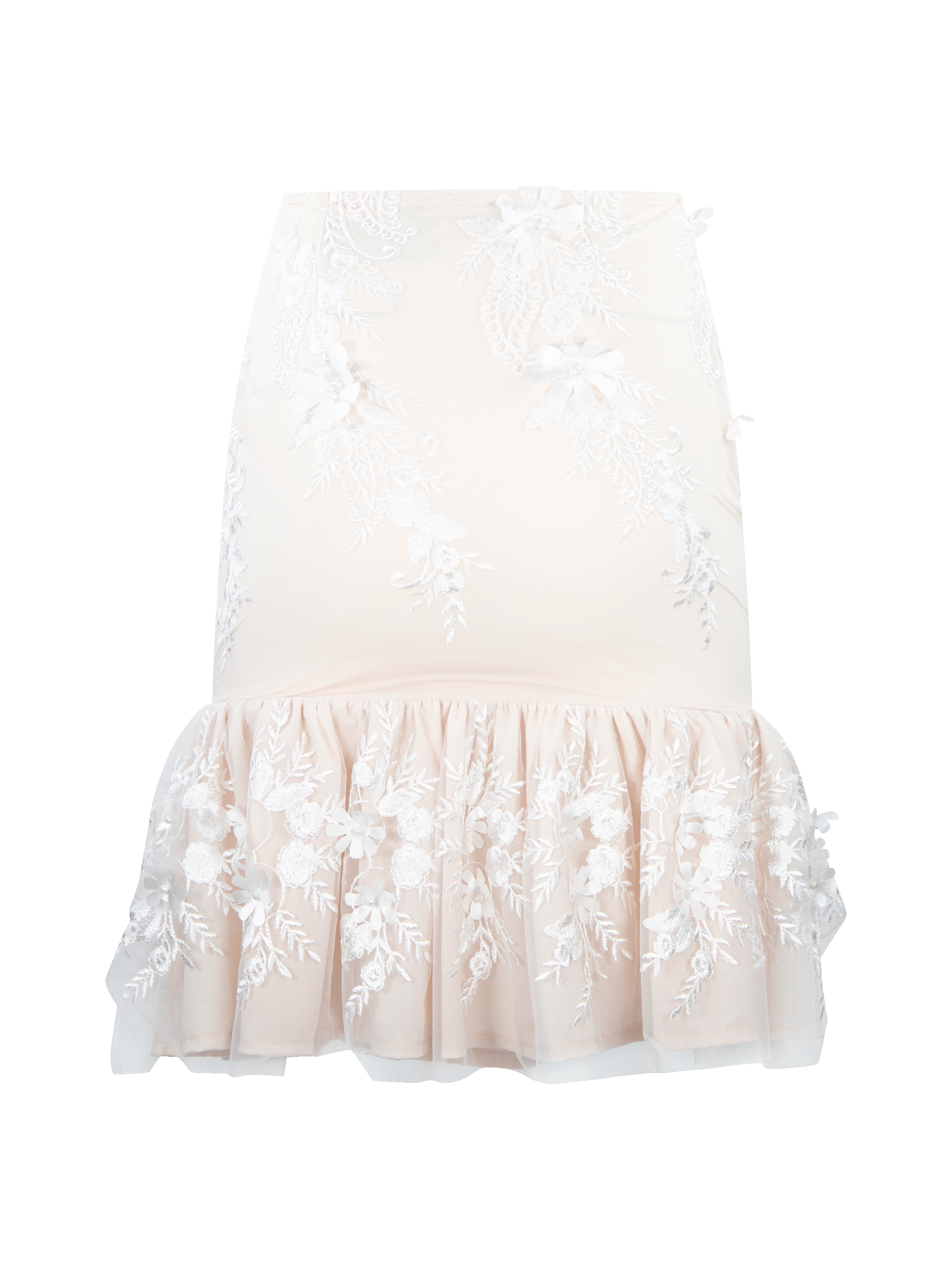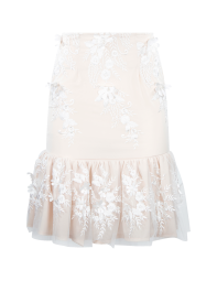 Falda ceñida con volantes fruncidos en la parte inferior, textura de flores. Prenda confeccionada con recuperación de telas rescatadas de maquiladoras de ropa.